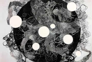 Growth is an installation of cutout monotypes that morphs and adapts dependent on its location. The work focuses on exploring the cell, its “imperfect perfections” and “organized chaos.” Of particular interest is the cell’s ability to mutate, evolve, and adapt—processes that are mirrored in my experimentation with printmaking and through the interventions I make in … Continue reading Growth